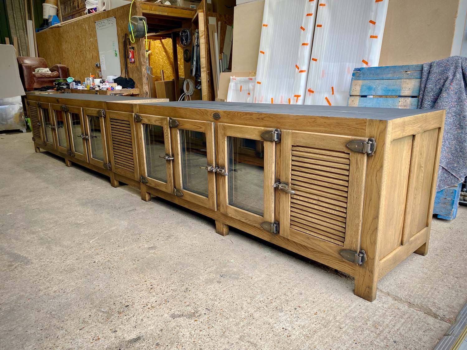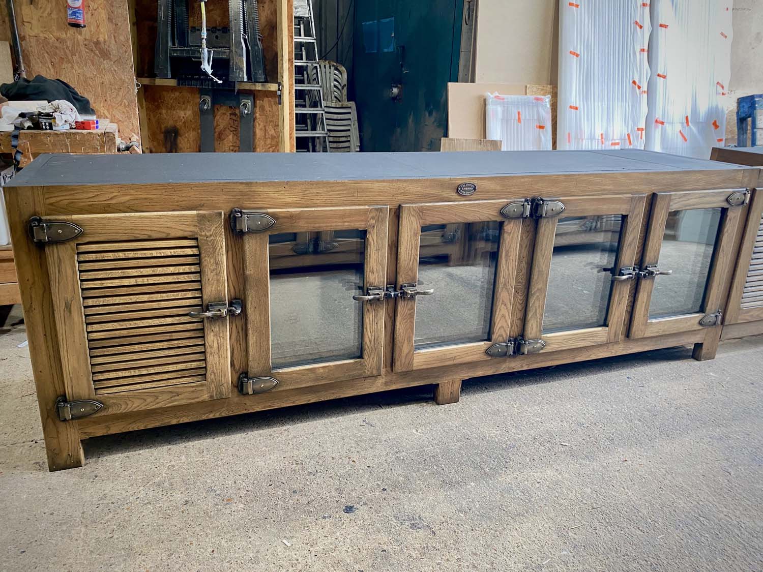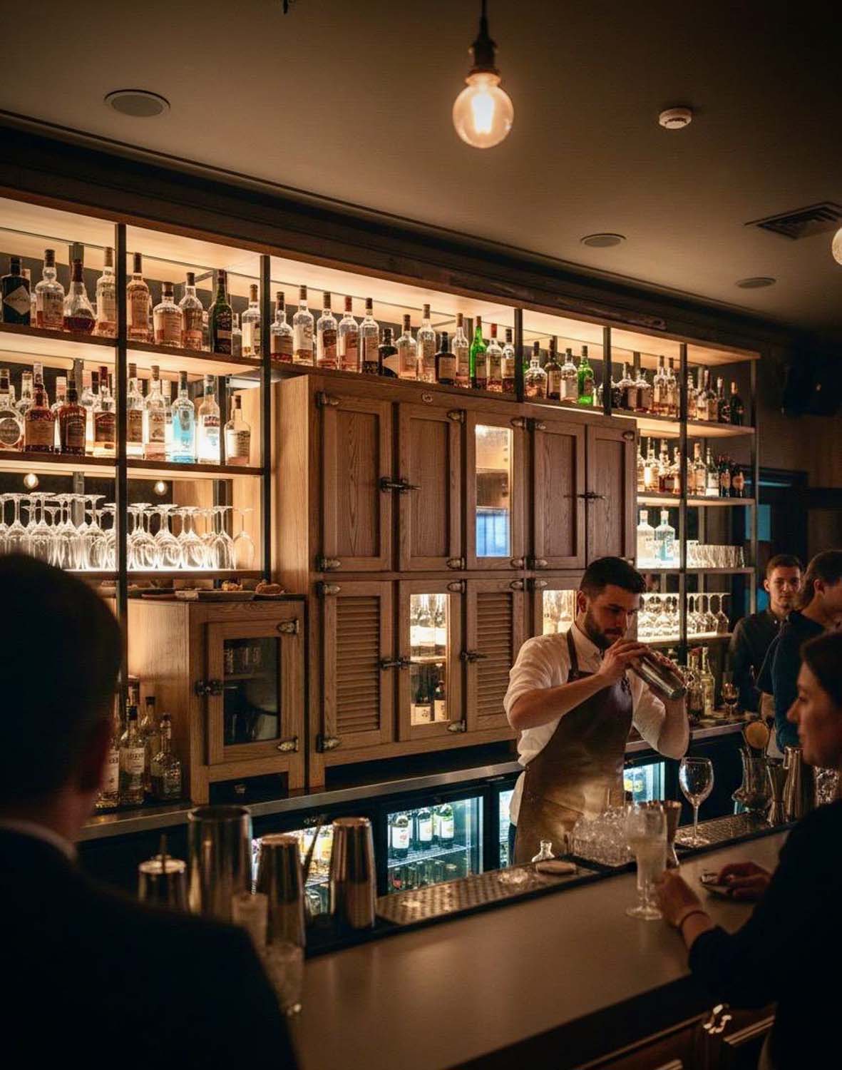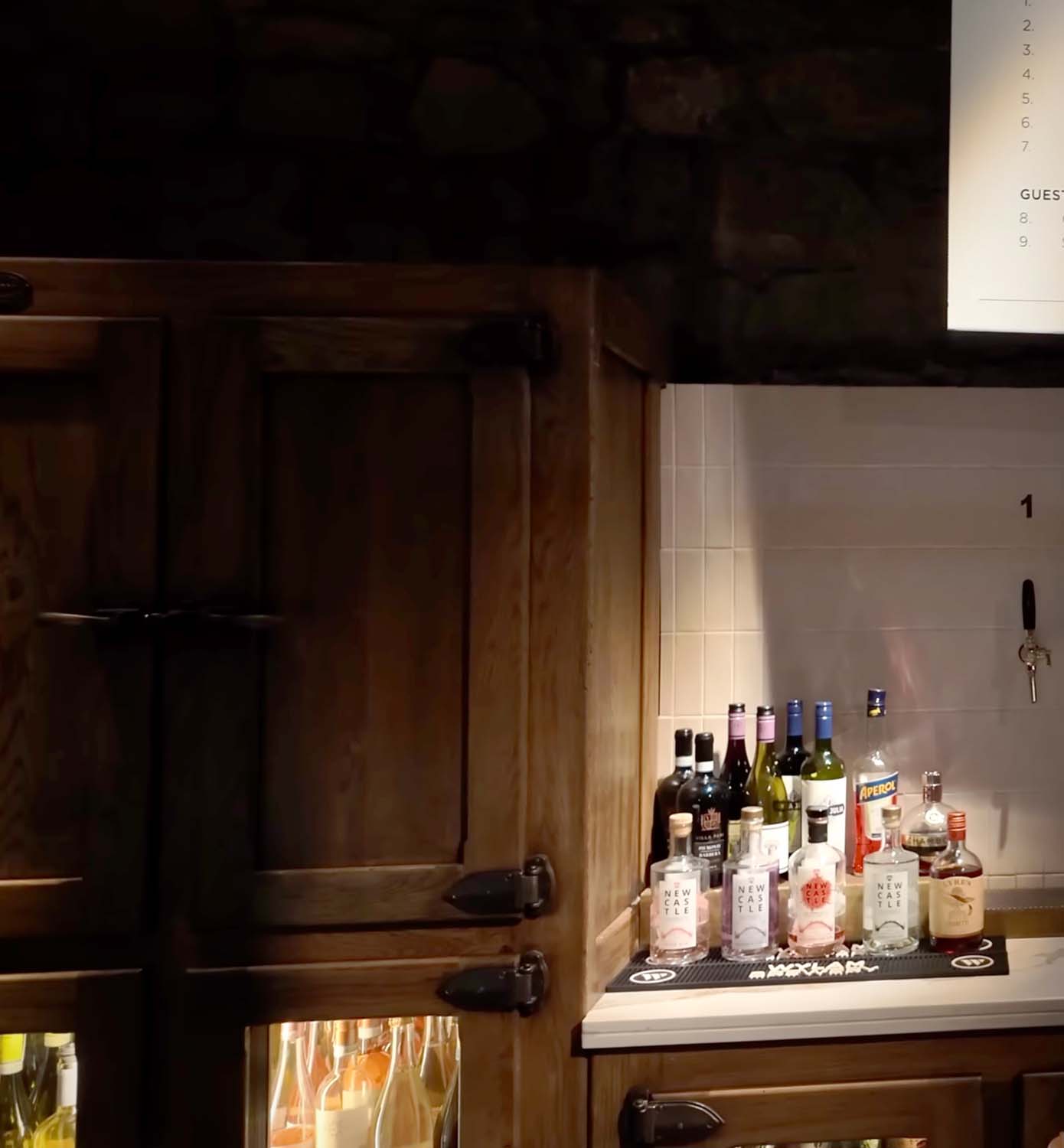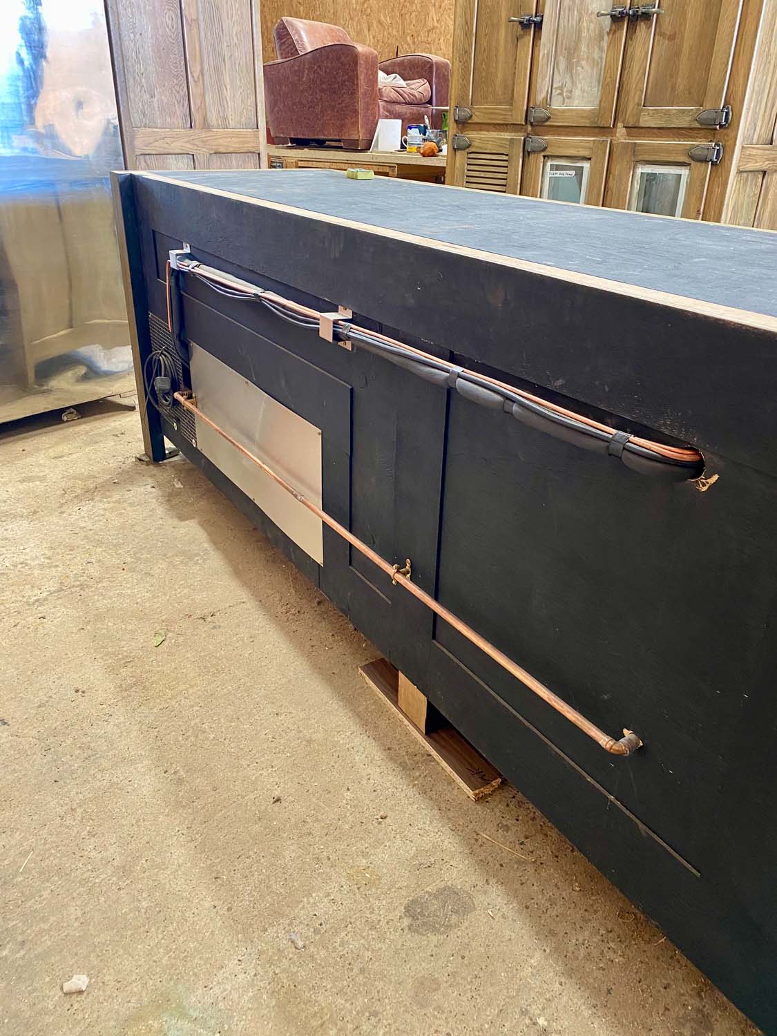 The bar is constructed from reclaimed timber and fitted with our own bespoke bronze / brass furniture.